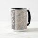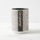 Det delikat fotoet av stenstruktur täcker ha som huvudämnedelen av denna mugg. Motsats av handtaget, finns det ett semitransparent lodrätnamnbaner. Banret är svart, och text är den ljusa - gråna för att tända - bruntet.