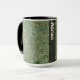 Det delikat fotoet av stenstruktur täcker ha som huvudämnedelen av denna mugg. Motsats av handtaget, finns det ett semitransparent lodrätnamnbaner. Banret är svart, och text är den ljusa - gråna för att tända - bruntet.