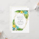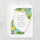 Exotisk turkos och sommartid på gult-strand-blommigt-bröllopsinbjudan med riklig tropisk grej i ett gyllene geometriskt ram-anpassade till dina händelsespecifikationer. Perfekt för varje tema eller trädgårdsbröllop. QR-koden på andra sidan går till din bröllop-webbplats där människor kan lära sig mer och osa.