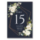 Det här bröllop-bordsnumret har i dag och i trendig en komplex geometrisk blandning av och vattenfärg, vit blommigt och eukalyptus grönt blommigt, över en modern marin blå struktur. Utformningen är densamma på båda sidor. Copyright Elegant Inbjudan. Alla höger reserverade.