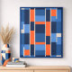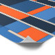 En modern geometrisk abstrakt design bestående av angränsande rektanglar och fyrkanter i ljusblå, mörk blått och orange, åtskilda med tunt grått linjer. Layouten formar parallella vågräna med en balanserad upprepning av färg och former som skapar ett rytmiskt och strukturerat utseende som påminner om en vägg eller contemporary mosaikteckning.