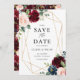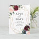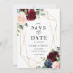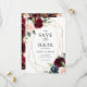 Meddela din bröllop-dejt till familj och vänner med detta fall blommigt spara datum meddelande. Den har vattenfärgade illustrationer av burgundi, och marint blått ro och peonier, bladaccenter och faux foil geometric ram. Den här boho rustic blommigt sparar datumkortet är perfekt för fallbröllop. Anpassa genom att lägga till information om namn, datum, plats och andra händelser.