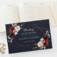 I modern och trendig har den här bröllop-gästboken en ytlig koppargeometri som utrustats med vattenfärgen eukalyptus greenergiy och burgundy och rosa blommigt, över ett modernt marinblått struktur. Texten finns i en matchande blek, vit rosa färg. Copyright Elegant Inbjudan. Alla höger reserverade.