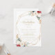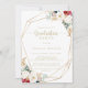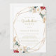 Den här inbjudan till den geometriska klassiska studentfesten för blommigt i guld är perfekt för ett firande. Utformningen har vattenfärgade vita blommor, blommor och bär från guld med grönt i elegant buketter.
