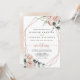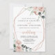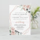 Den här geometriska blommigten för rosa fram- och baksädesbröllop är perfekt för ett rustiskt bröllop. Konstruktionen har elegant vattenfärgsdamm i ro och grönt bladverk, väl sammansatt i vackra buketter och adorerar ett charmerande geometriskt ram. Spara papper genom att på baksidan av inbjudan ange mer information i stället för på ett separat visitkort.