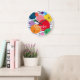 Tema är lämpligt för pojke eller flicka. Det är könsneutralt. Dekorera ditt baby- eller barns rum med den här färgstarka geometriska designen som fungerar med grundläggande geometriska former i cirklar och rand. Underbart tema som ditt barn lätt kan växa in i. Lägg till i dekorn med den här ljusa, färgstarka och roligt personligens väggklocka. För in färg i deras liv. All text kan ändras.