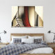 A mesmerizing abstract composition exploring the tension between straight lines and fluid curves. Vertical stripes in shades of red, gold, and black create a dynamic visual rhythm, while curved geometric forms traverse the composition, generating depth and movement. The artwork plays with perspective and optical illusion.