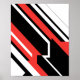 The design features a bold combination of black, red, and white colors arranged in sharp geometric patterns. Thick black and red stripes intersect and overlap on a clean white background, creating a strong sense of energy, movement, and modern style. The contrast between the colors gives the composition a powerful and sleek look, reflecting a technical and sporty aesthetic. The overall design feels structured, balanced, and visually striking.