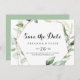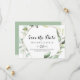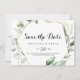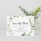 Denna geometriska elegant guld grey vågrät bröllop spara datum är perfekt för ett modernt bröllop. Konstruktionen har handmålade botaniska gröntar av eukalyptus löv, som adorerar ett guld-geometriskt ram.