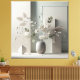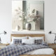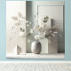 Ein modernes Stillleben, das florale Leichtigkeit mit geometrischer Präzision verbindet: Zarte weiße und grünliche Blüten, ornamental gesetzte Gräser und Blätter entfalten sich in einer matten Keramikvase. Die Szene wird von geometrischen Objekten und sanften Schatten begleitet, die dem Bild Tiefe und Struktur verleihen. Die reduzierte Farbpalette aus Weiß, Beige und Grau schafft eine ruhige, elegante Atmosphäre – ideal für Räume, die Klarheit und ästhetische Balance suchen.