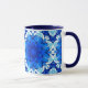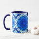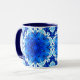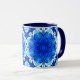 Mugg i en geometrisk blomma mönster i djup koboltblått och marin/indigo, på vit accin med turkos
