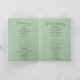 Det här geometriska guld-tropiska, grönt uppfällda bröllopsprogrammet är perfekt för ett målbröllop. Utformningen har handmålad vattenfärg guld och grönt handflatan och banan löv med rosa blommor som buntas till buketter, med tillägg av ett geometriskt ram. Inkludera ett citattecken eller ett kort-meddelande, serviceordning, bröllopsfest och tackmeddelande.