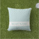 Aqua Herringbone mönster utanför dörrkudden. Kustdekoration utomhus med geometrisk mönster i Aqua Blue och namn mall för yttre sittplatser. För strandhus eller nautisk hemtorkare väljer du bomull eller polyeter. Personligens kudde är en vacker presentidé för henne och honom, båtar och sjömän. Patio Däcker dekorationer av idéer som gjorts med oceanen kärlek. © Design y.BEE SEA