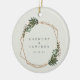 Gifte du dig i år? Lägg till ett minne i träd med den här moderna bröllop keramiska prydnaden med ett guld-geometriskt ram omgivet av gröna och vita blommor. Inuti ram finns ert datum namn och bröllop. Baksidan har ditt favoritfoto. Detta prydnadsföremål ger också en underbar gåva till ett nygift par inför deras första jul. Ram: a) Designad av Freepik<a href="http://www.freepik.com">