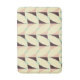 Geometric pattern with overlapping beige, peach, and brown triangles, accented by teal circles. The design forms a zigzag, creating a retro vibe.