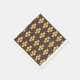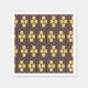 Repeating geometric pattern with orange and blue hexagons forming floral shapes on a dark background. The design conveys a retro, symmetrical feel.
