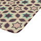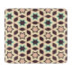 A geometric pattern with star shapes in brown and teal, surrounded by a beige lattice. The design is seamless, creating a retro and symmetrical vibe.