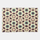 A geometric pattern with star shapes in brown and teal, surrounded by a beige lattice. The design is seamless, creating a retro and symmetrical vibe.