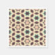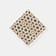 A geometric pattern with star shapes in brown and teal, surrounded by a beige lattice. The design is seamless, creating a retro and symmetrical vibe.