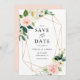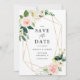 Geometric Watercolor Vår-blommor Spara datumkortet | Meddelande om datum för när du ska spara datumkortet till familj och vänner med den här blommigten i bröllop. Den har vattenfärgade illustrationer av vitt, persikofärgat och rosa ros och peonier, bladaccenter och faux foil geometric ram. Den här eleganten sparar datumet är perfekt för trädgårdsbröllop och vår bröllop. Matchande objekt är tillgängliga.