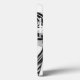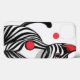 This bold, graphic cat illustration features a stylized feline in profile, centered against a clean white background with a subtle black line border. Black and white concentric circles form its body, accented by vibrant red circles for a pop of color. With simplified features like prominent ears and a sleek tail, this modern, geometric artwork evokes a contemporary, abstract vibe with even lighting and a serene feel.