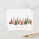 En minimalistisk design som visar en färglös skog av stiliserat, geometriskt träd under fallande snöflingor. De ljusa färger och moderna formerna skapar en glatt och festlig helgdag.