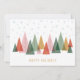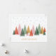 En minimalistisk design som visar en färglös skog av stiliserat, geometriskt träd under fallande snöflingor. De ljusa färger och moderna formerna skapar en glatt och festlig helgdag.