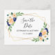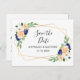 Dessa kort för att spara datumet har en akvarellblomma design med vita, korall- och marinblå blommor och en falsk gyllene geometrisk kant. Anpassa texten med din egen text.