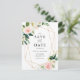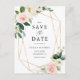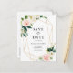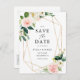 Meddela din vigsel datum till familj och vänner med detta blomsterrika spara-datum postkort. Den har akvarell illustrationer av vita, persika och rosa rosor och peonior, blad accent och falskt guld geometrisk ram. Denna eleganta spara-datum är perfekt för trädgårdsbröllop och vårbröllop. Matchande artiklar finns tillgängliga.