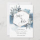 Elegant och Unik geometrisk Bröllop (eller annan händelse) Spara datum med delikat blå vattenfärg tvättande på bakgrunden, exquisite blommigt bouquets med geometrisk gyllene ram och använda av modern handskriven kalligrafi. Blad och blommor i dammblått, marinblått, vitt, grått och sage-toner. Bakåt i blått tvätta. En del av vår "Rustic Blue Mountains bröllop och evenemangsinsamling".