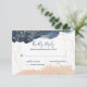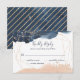 Geometrisk bröllop OSA i marin, guld och . Detaljerna är inramade i en guld-geometrisk form med en stänk av vattenfärg i flottan överst och vid grund. Dammbristningar i guld dekorerar kortets överkant och grund. Kortets baksida är designad med guld rand i ett diagonalt mönster över en marin blå vattenfärgsbakgrund. Du kan lägga till eller ändra OSAN på kortet. Om du behöver göra fler ändringar kan du klicka på anpassa länk/knapp och ändra sak som storlekt teckensnitt, stil, teckensnitt färg etc.