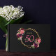 En gäst Bok under en 50:e (eller någon annan ålder) födelsedagsfest. En svart chic med faux guld geometric ram. Dekorerad med mörkens lila och burgundblommor, ro och boho stil fjädrar. Mallar för namn, 50 år och ett datum. Födelsedatum eller datum för party. Namn är skrivet med ett handskript i stil, rosa färgad brev, ålder i lila och datum med gyllene siffror. Text på ryggraden.