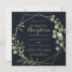 Denna geometriska guld blå grön bröllopsinbjudan är perfekt för en enkel efter-flyktfest. Designen har handmålade vackra gröna blad på en mörkblå bakgrund, prydd med en guldgeometrisk ram.