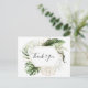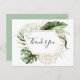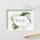Den här geometriska, gyllene, tropiska gröna tack-postkortet är perfekt för ett destinationbröllop. Designen har handmålade akvarellmotiv i guld och gröna palm- och bananblad med rosa blommor samlade i buketter som pryder en geometrisk ram.
