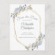 Romantiska akvarell dammblå blommor och blad på guld geometrisk ram vigsel inbjudan kort. Lägg till din vigsel information, ändra typsnitt färger, storlekar eller typsnitt stilar till denna moderna botaniska krans spara datum. Denna eleganta design är idealisk för vår och sommar bröllop.