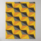 En fet geometrisk teckning som består av upprepade kubliknande former i ett tessellerat mönster. Varje kub är uppdelad i trekantiga och parallellogramsavsnitt fyllda med gult, orange, grått och svart. Den exakta arrangemanga skapar en optisk illusion av tredimensionellt djup, och skapar att det plana yta visas som en serie staplade block. Den rena linjer och pulserande färg-paletten ge ger ett modernt, slående och synligt utseende.