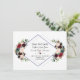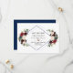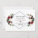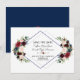 Elegant kortdesign med vackra akvarell-burgunder, merlot- och marinblå blomsterbuketter, en dubbel diamantform, på vit och på baksidan samma blommor på en marinblå bakgrund. Det kan vara ett bra val för bröllop under alla årstider, särskilt för höst- och vinterbröllop. Använd verktyget Anpassa för att lägga till din information och göra ändringar. För matchande artiklar, besök min Merlot Marin Geometrisk Blomster Kollektion.