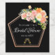 Ett trendig och elegant vin flaska märkre för en möhippa. Dekorerad med ett enkelt kopparfärgad hexagongeometriskt ram. Med en bukett av ro i vitt, rosa och korall Med lite grönt foliage. Elegantens svarta bakgrund. Mallar för brudens namn och ett datum. Med texten: Möhippan skriven med ett handskript i stil. Grönt färgad brev. Med två gyllene mousserande vin-glas som dekoration.