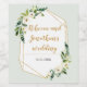 En geometrisk ram i guld med grönska och vita blomstermotiv i vattenfärg i hörnen är placerad mot en ljus aquafärgad bakgrund på denna etikett för vinflaska. Ger en elegant look för ett bröllop, brudvisning, förlovningsfest, födelsedagsfest eller någon annan blomsterinspirerad festlighet. Finns tillgänglig med matchande produkter.