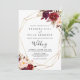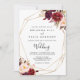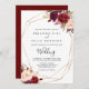 Denna geometriska rustika boho blommiga bröllopsinbjudan är perfekt för ett enkelt bröllop. Designen har rosa, lila, röda och burgunderfärgade akvarell-peonior samlade i eleganta buketter med grön lövverk, som pryds av en guldgeometrisk ram.