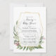 Skogsgrej kör genom möhippa- eller babyduschinbjudan med vild örter, ferns, löv och eukalyptus med guld geometriska ram.