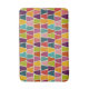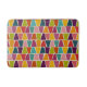 Den här geometriska utskriften har enkla trapezoidformer i skuggor av ljusa färger av kalkgrönt, turkosblått, lila, teal, rött, orange, gult och rosa som ställs in mot en gräddbaksida för ett mosaikglas eller ett nedfläckad glas. Det här badformatet koordinerar med andra objekt i samlingen Handflatan Vår från Delfuneum.