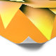 En stiliserad geometrisk illustration av vargens ansikte, med vassa vinklar och vibrerande färg. Vargen har gult ögon och en övertoningsbakgrund som övergår från orange till gult.