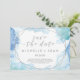 Den här geometriska vattenfärgen silver sparar datumkortet är perfekt för ett modernt bröllop. Konstruktionen har mjuk himlar-blått och teal-vattenfärg överdragen med geometriska former i glatt faux silver glitter. Obs! Den här designen har inte silver glitter. Det är en högkvalitativ grafik som framstår som silver glitter.