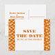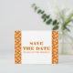 Med ett trendigt orange triangulärt flerfärgat mönster är detta Geometriska trianglar Spara datum vykort ett bra val för ett modernt bröllop. Detta enkla vykort är lätt för dig att anpassa med bröllopsdetaljer. För fler anpassningsalternativ, klicka på knappen Anpassa den.