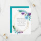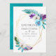 Turkos och lila akvarell tropiska blad bröllop spar datum med guld geometrisk ram och elegant typografi.