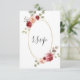 Bröllop RSVP-kort med en geometrisk oval mittdel med burgunderröda blommor och eukalyptus.