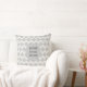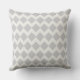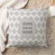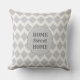 Vackert grått geometriskt diamantmönster på en nästan vit bakgrund. Framsidan av kudden har en stor grå prick med texten: Hemma är bäst.