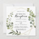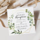Denna geometriska guld tropiska gröna bröllopsinbjudan är perfekt för en enkel efter-firande. Designen har handmålade vackra gröna blad som pryder en gyllene geometrisk ram.