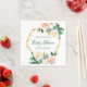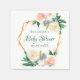 Ett trendig papper napkin för en babydusch. Dekoreras med vattenfärgat stort lush ro i vitt, rosa och korall. Elegantens vita bakgrund. Mallar för mamma som ska vara namn och ett datum. Med texten: Baby Shower skriven med ett handskript i stil. Grönt färgad brev.